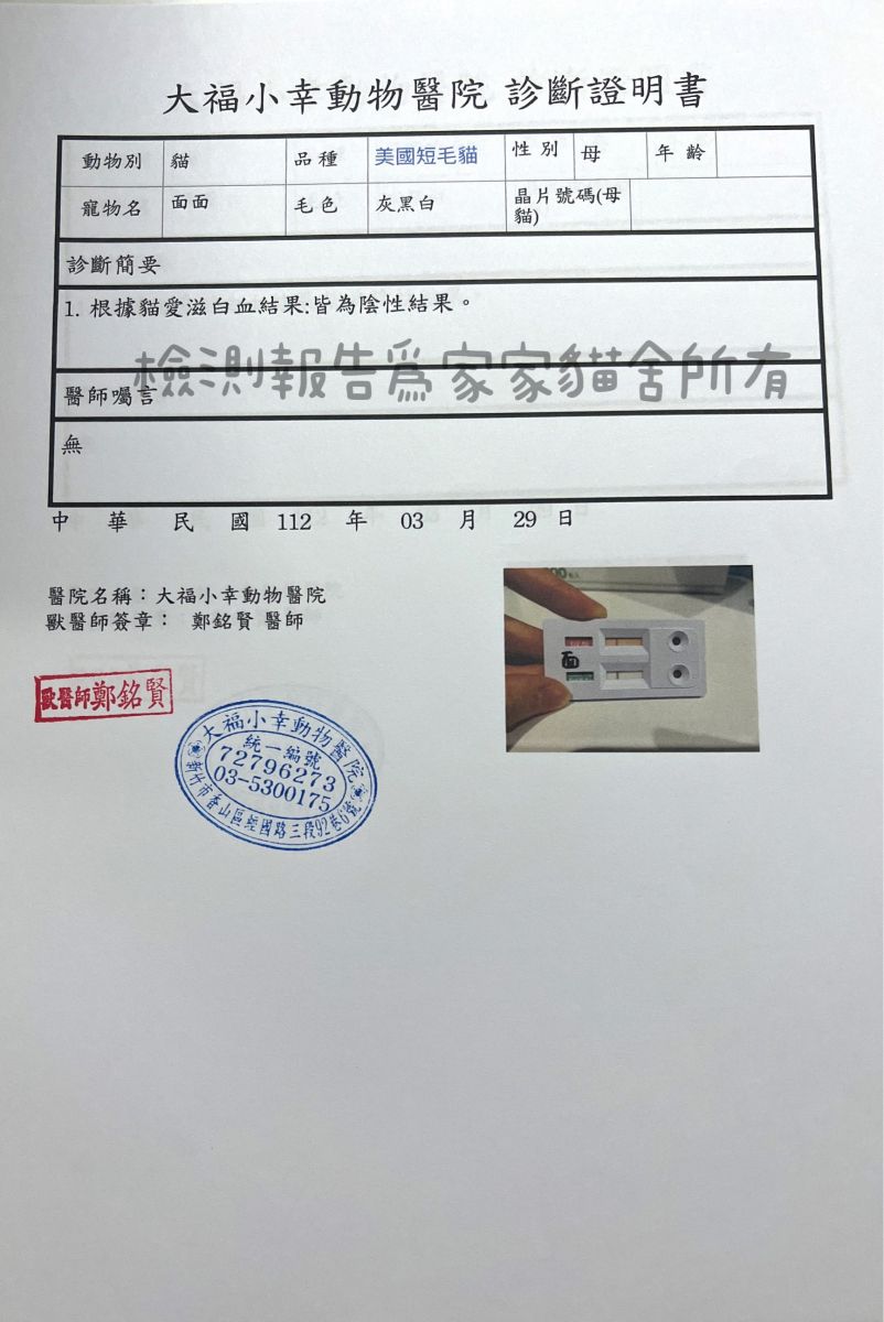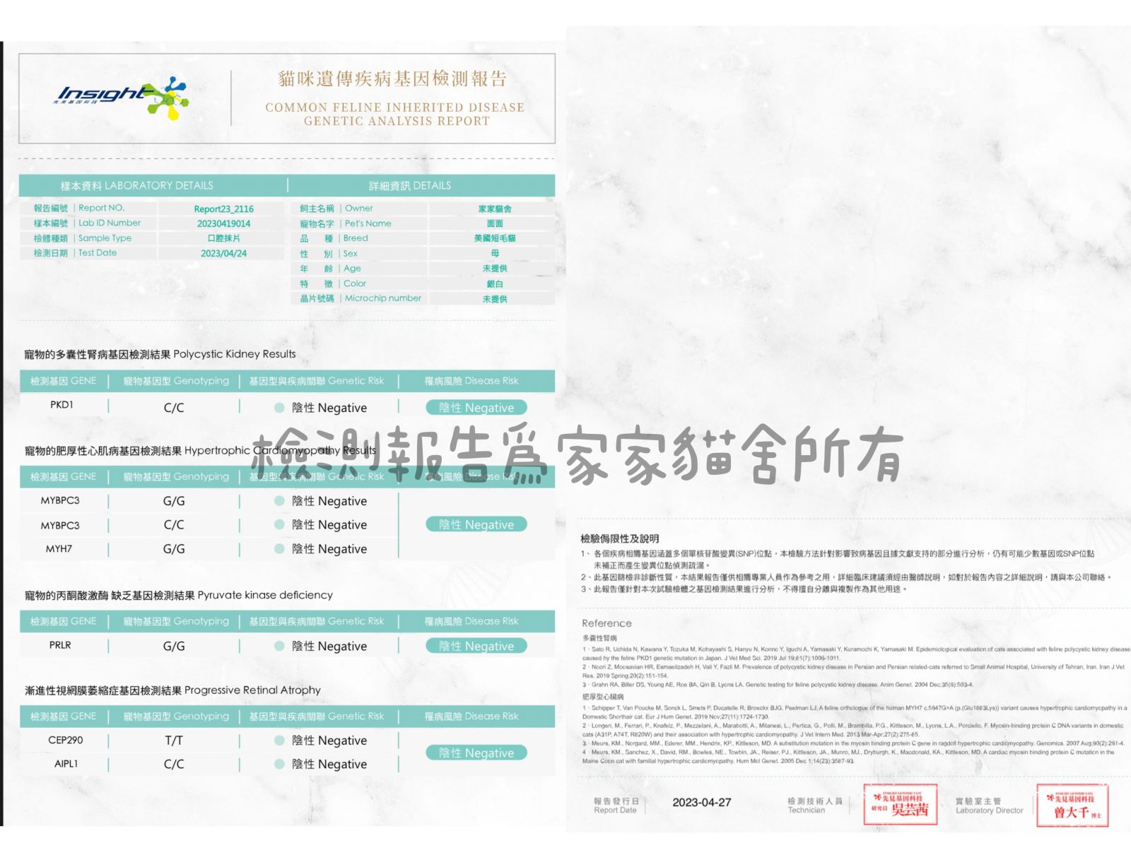 面面 商品圖像 商品資訊 遺傳病及傳染病檢測報告 檢驗報告皆為貓舍所有,請勿任意轉貼。 小貓領回新家時, 貓舍會提供父母檢驗報告影本給小貓家長。 商品Q&A 提問者稱呼 E-mail 手機 電話 留言內容 驗證碼