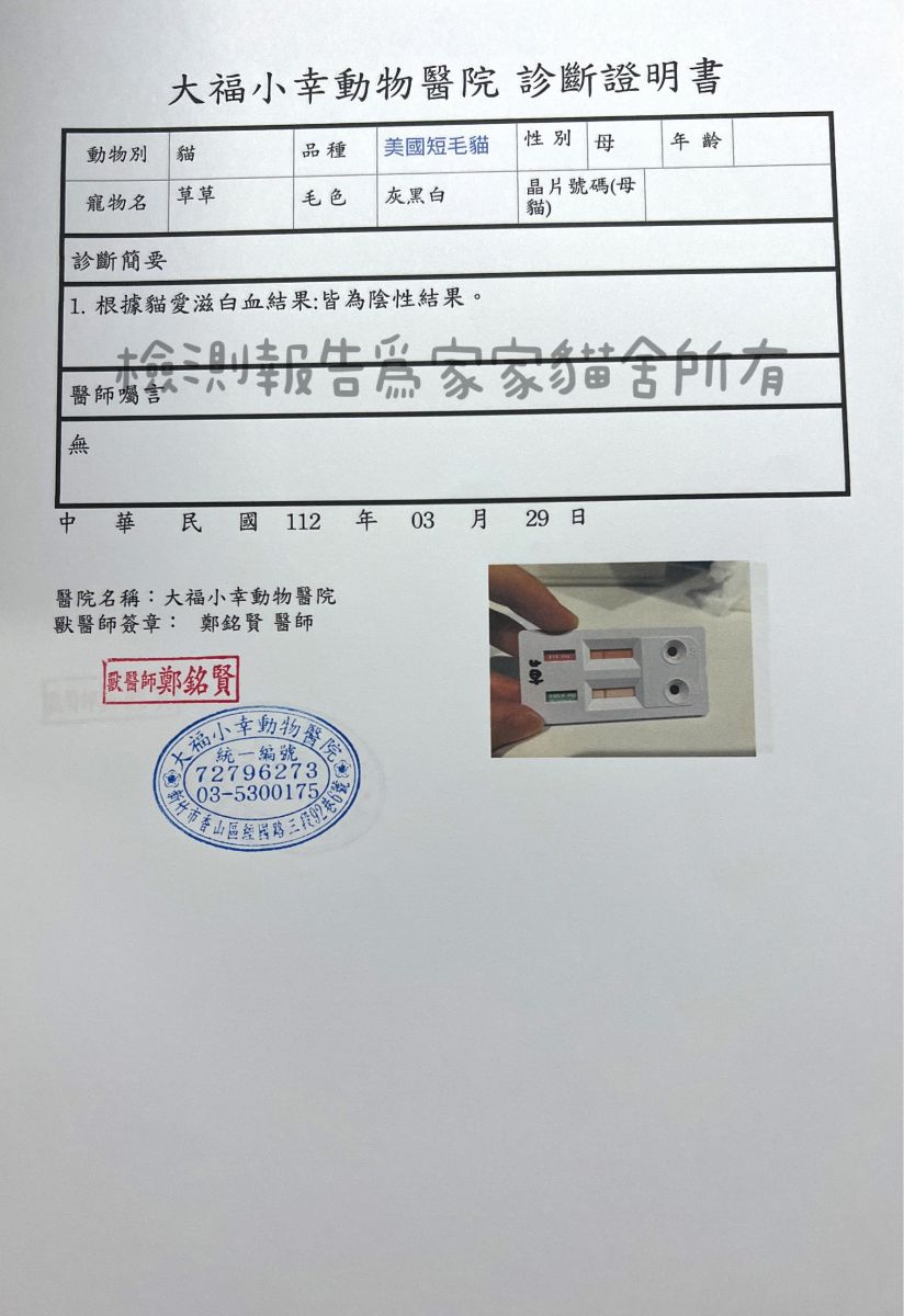 草草 商品圖像 商品資訊 遺傳病及傳染病檢測報告 檢驗報告皆為貓舍所有,請勿任意轉貼。 小貓領回新家時, 貓舍會提供父母檢驗報告影本給小貓家長。 商品Q&A 提問者稱呼 E-mail 手機 電話 留言內容 驗證碼