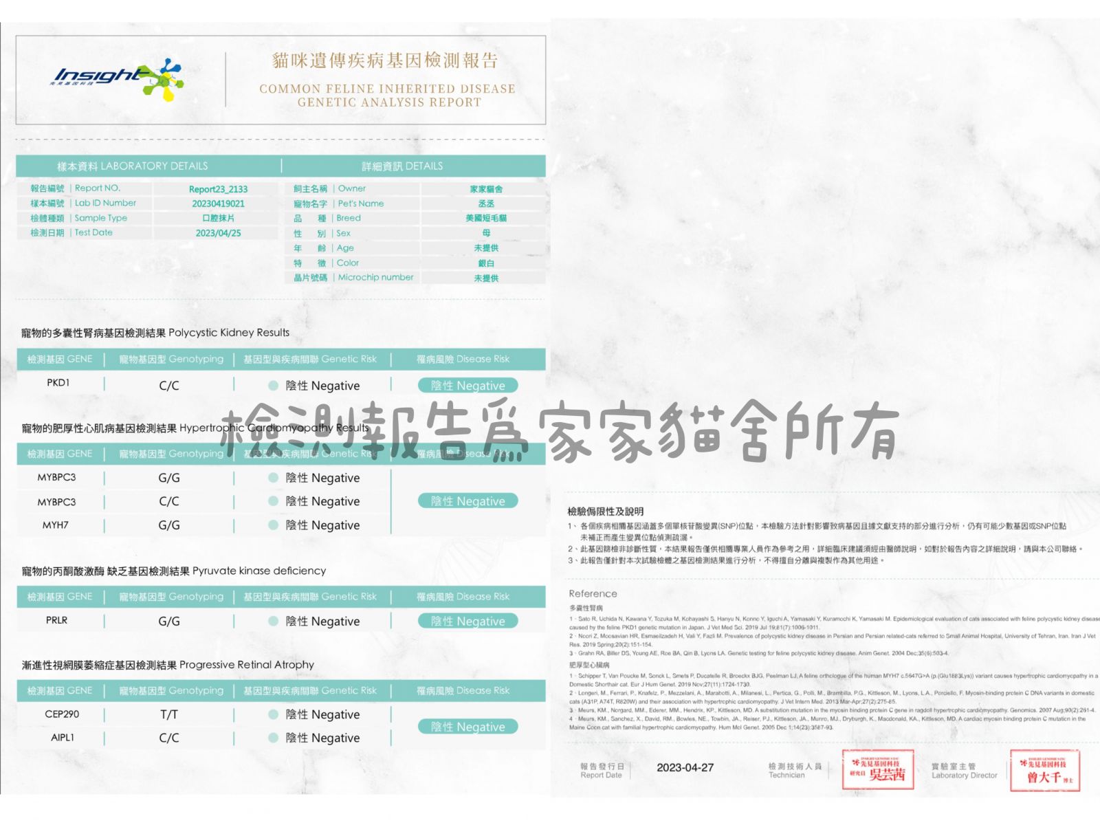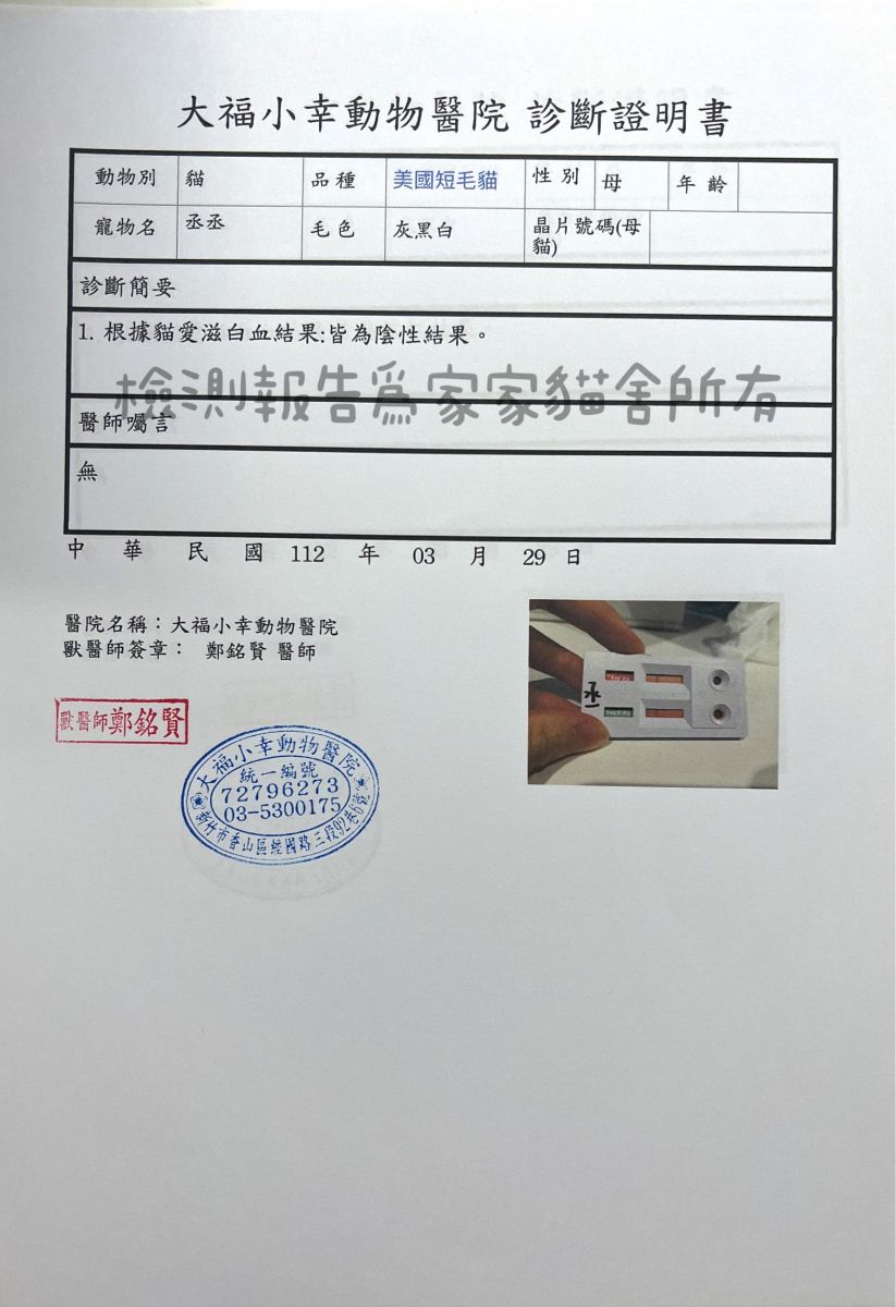 丞丞 商品圖像 商品資訊 遺傳病及傳染病檢測報告 檢驗報告皆為貓舍所有,請勿任意轉貼。 小貓領回新家時, 貓舍會提供父母檢驗報告影本給小貓家長。 商品Q&A 提問者稱呼 E-mail 手機 電話 留言內容 驗證碼